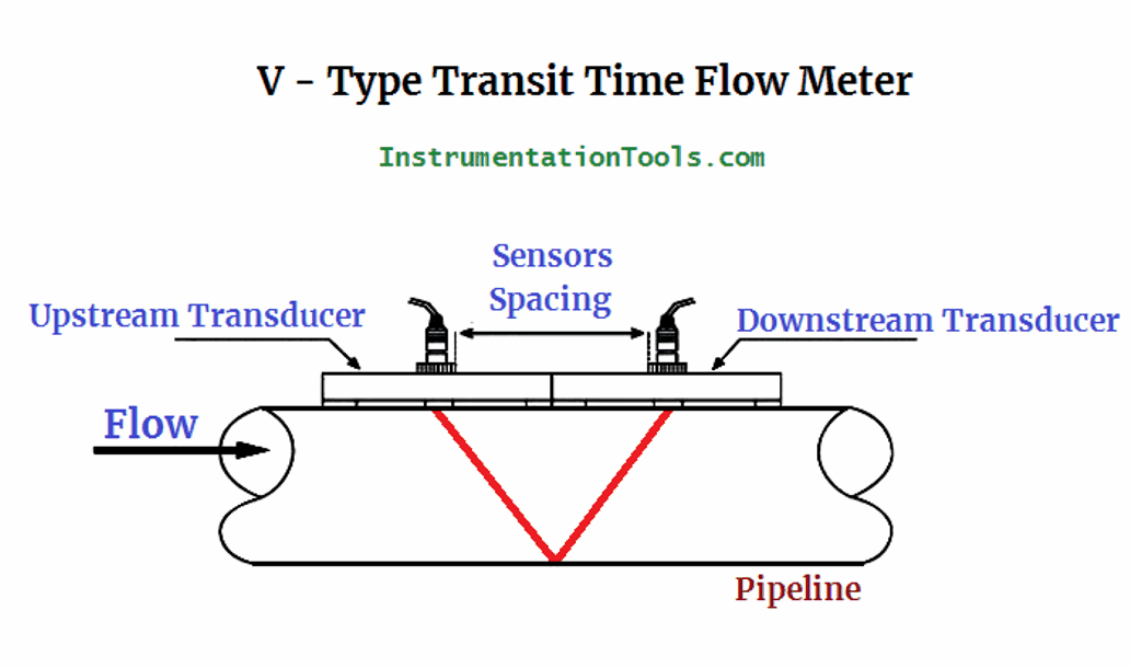 The two sensors are installed on a pipeline such that the ultrasonic waves travel in the form of v-shape, hence called them as V-Type Transmit time flow meters, as shown in below figure.
